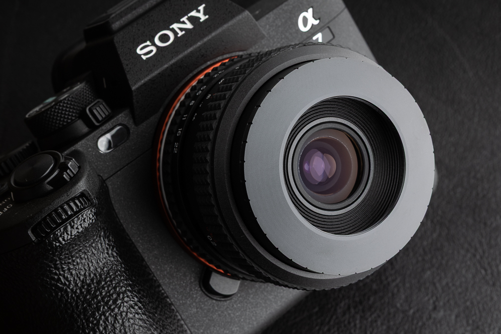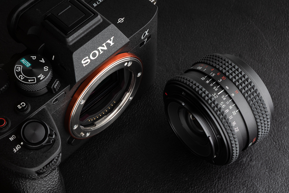 KISTAR 28mm F3.2をα7 Ⅳに装着したところ。ヤシコン風のクラシカルデザインが思いのほかα7シリーズとよく似合う。
